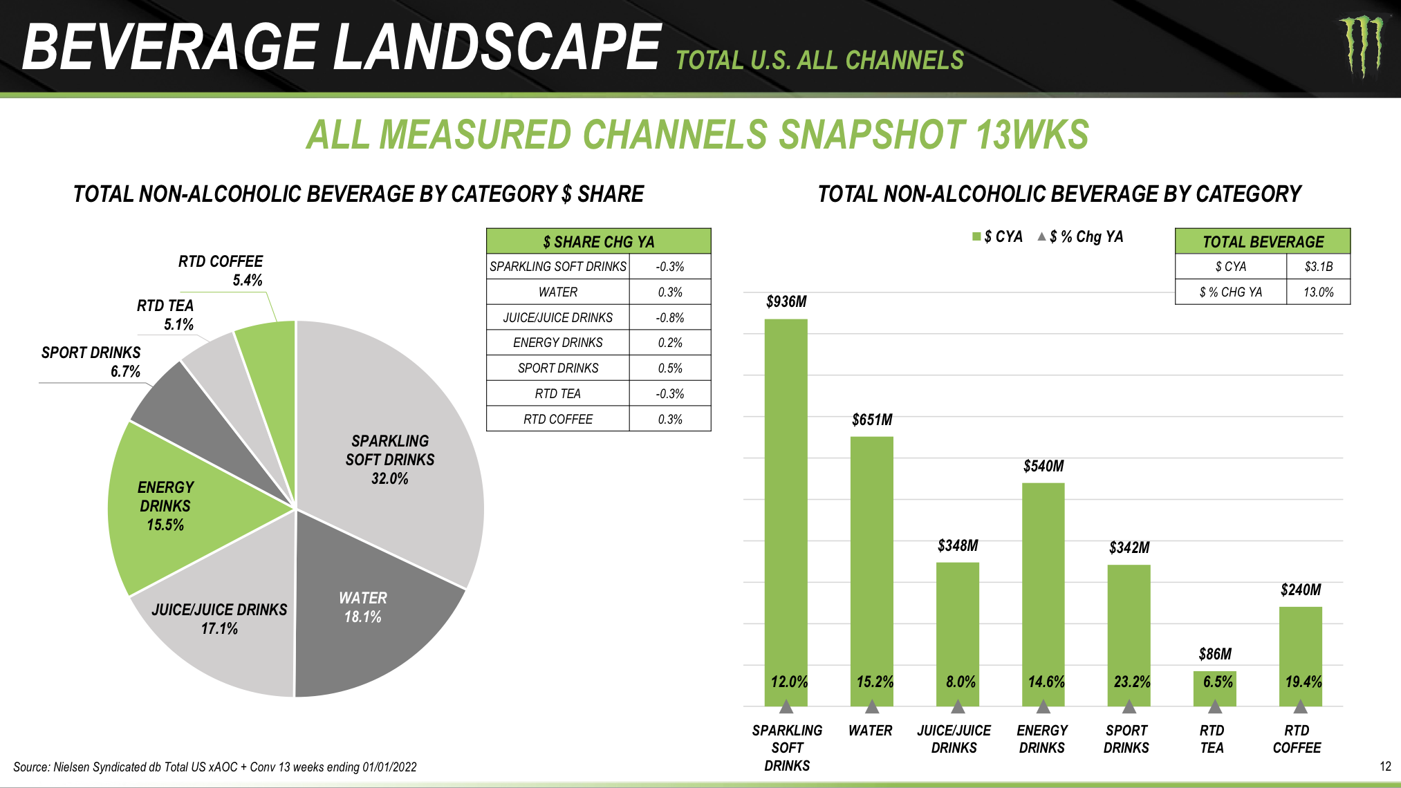 Based on data collected by Nielsen and reported in Monster's investor presentation of January 2022, energy drinks in the U.S. accounted for 15.5% of total non-alcoholic beverage sales in the 13 weeks ending 2021.