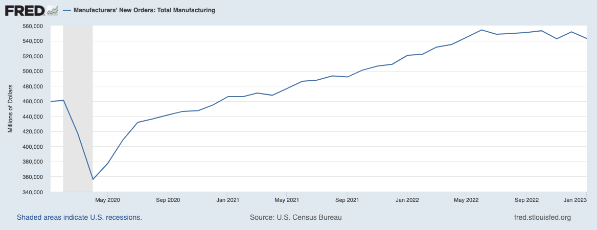 - Manufacturing output has also declined 1.7% from its post-pandemic high in May 2022