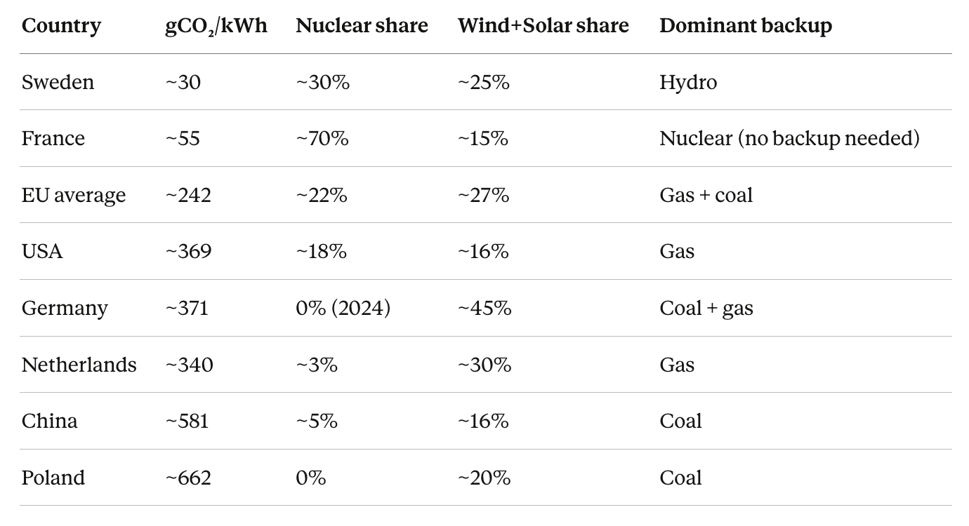 Read the table vertically. The cleanest grids are nuclear grids. The dirtiest grids include some of the highest renewable penetrations on earth. Germany has 45% wind and solar — more than France, more than Sweden, more than the United States — and emits nearly seven times more CO₂ per kilowatt-hour than France. The Netherlands has 30% wind and solar and emits six times more than France. This is not transitory. It is not a phase that will be solved by adding more panels. It is structural and permanent, because when the wind drops, the gas turbine fires — and it will fire every winter, every Dunkelflaute, every cold still evening, for as long as the grid depends on intermittent sources. A country that is 45% renewable is also, by definition, 55% fossil on the hours that matter. You cannot average your way out of a winter.