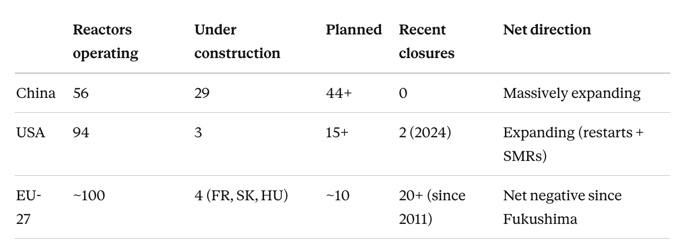 The nuclear pipeline makes the divergence concrete. As of early 2025, this is what the world's three major blocs are building: