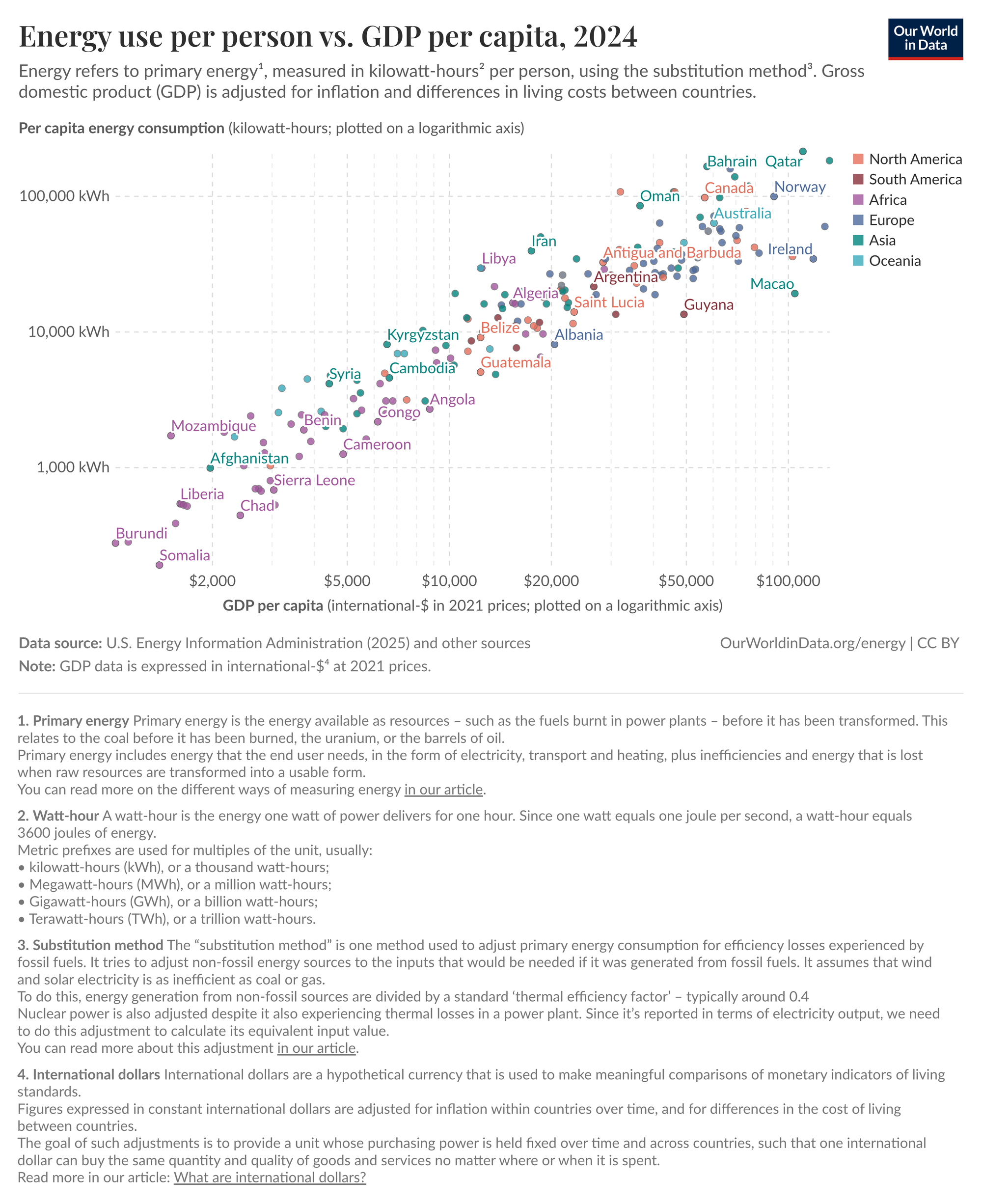 Plot GDP per capita against energy consumption per capita across all nations and the relationship is stubbornly, almost perfectly linear. Qatar, Norway, the United States, and Australia cluster at the top right. Bangladesh, Ethiopia, and Myanmar at the bottom left. There are virtually no rich, low-energy countries. The gap is not closing: EU nominal GDP per capita stood at roughly $40,000 in 2024, versus over $85,000 in the United States — a gap of more than 50% that has widened, not narrowed, over the past two decades. Even on a purchasing-power-adjusted basis, the deficit is 38%. The apparent exceptions — Switzerland, Ireland — are either running on hydro geography they did not choose or have GDP figures inflated by corporate tax structures that do not reflect real domestic production.